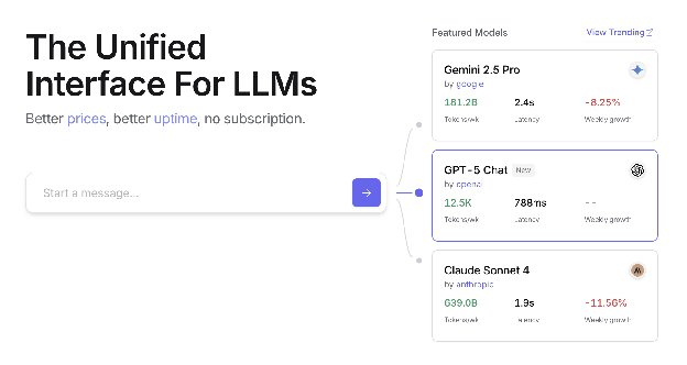 OpenRouter 通过单个 API 端点提供对数百个 AI 模型的统一接口。它提供自动故障转移和成本优化,可通过您首选的 SDK 或框架轻松集成。