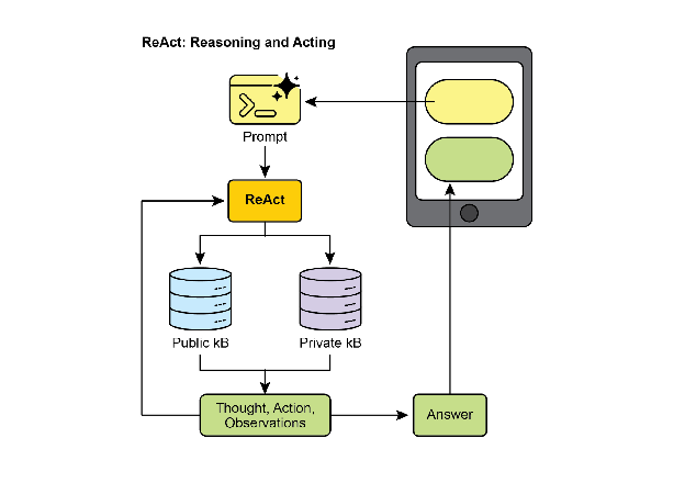 ReAct(推理和行动,见图 3,其中 KB 代表知识库)是一种将思维链(CoT)提示词与 Agent 通过工具与外部环境交互的能力集成的范式。与生成最终答案的生成模型不同,ReAct Agent 对采取哪些行动进行推理。这个推理阶段涉及内部规划过程,类似于 CoT,Agent 确定其下一步,考虑可用工具并预测结果。之后,Agent 通过执行工具或函数调用来行动,例如查询数据库、执行计算或与 API 交互。