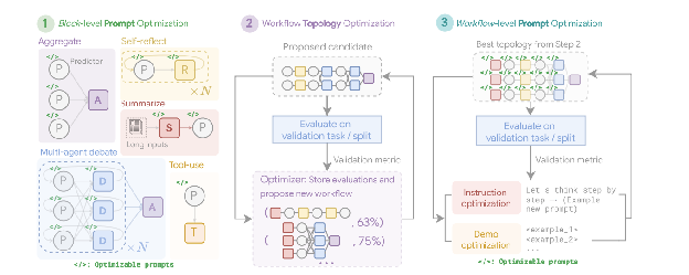 图 4:(由作者提供):多 Agent 系统搜索(MASS)框架是一个三阶段优化过程,导航包含可优化提示词(指令和演示)和可配置 Agent 构建块(聚合、反思、辩论、总结和工具使用)的搜索空间。第一阶段,块级提示词优化,独立优化每个 Agent 模块的提示词。第二阶段,工作流拓扑优化,从影响加权的设计空间中采样有效的系统配置,集成优化的提示词。最后阶段,工作流级提示词优化,在从第二阶段识别出最优工作流后,对整个多 Agent 系统进行第二轮提示词优化。