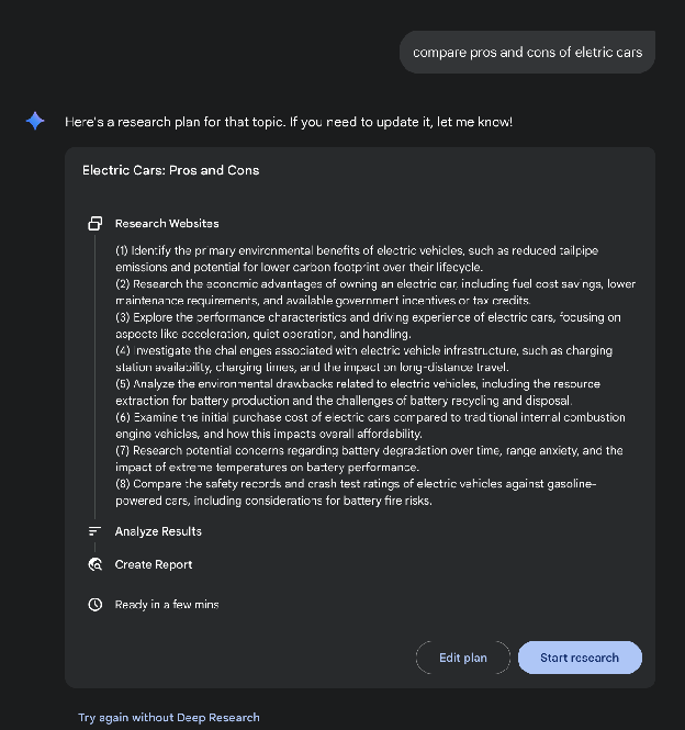 这些工具引入的一个基本转变是搜索过程本身的变化。标准搜索提供即时链接,将综合工作留给您。Deep Research 在不同的模型上运行。在这里,您为 AI 分配一个复杂的查询并授予它一个”时间预算”——通常是几分钟。作为这种耐心的回报,您会收到详细的报告。